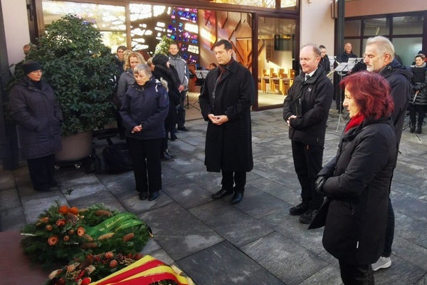 Denzlinger Vereine gedachten gemeinsam der Verstorbenen – Würdige Gedenkfeier auf dem Friedhof Denzlingen. Die seit Jahren von den Denzlinger Vereinen auf Initiative des VdK gepflegte gemeinsame Gedenkfeier fand auch am vergangenen „Totensonntag“ wieder eine sehr würdige Form. Musikalisch umrahmt wurde die Gedenkstunde bei der Einsegnungshalle durch den Musikverein, den Pop- und Jazzchor der Concordia und den Akkordeonverein. Das Wort ergriffen neben der VdK-Vorsitzenden Elfriede Behnke auch Bürgermeister Markus Hollemann sowie Pfarrer Thomas Herrmann namens der Kirchen. Petronella Rußer-Grüning verlas die Namen der im zurückliegenden Jahr verstorbenen Vereinsmitglieder. Schließlich legten sie gemeinsam Blumengebinde am Ehrenmal nieder.