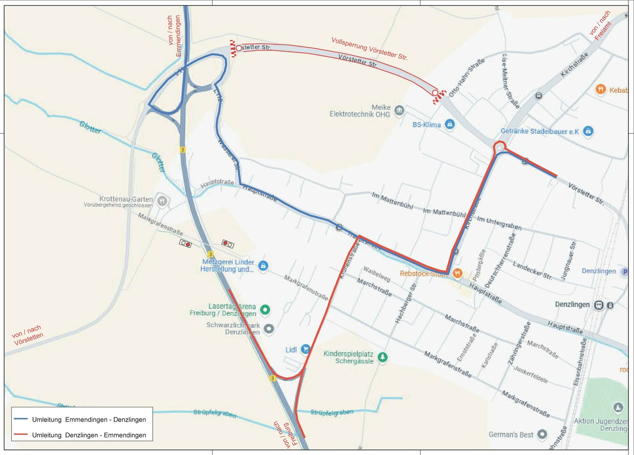 Die Erschließungsarbeiten erfordern eine bauzeitliche Vollsperrung der Vörstetter Straße, Ortszufahrt Denzlingen, zwischen der B3 und der Otto-Hahn-Straße. Ab dem 3. November 2025 wird der Verkehr über die Kirchstraße, die Hauptstraße und die Wasserer Straße geleitet. Alternativ kann die B3 über die Kronenstraße erreicht werden. Alle Umleitungen werden deutlich beschildert.