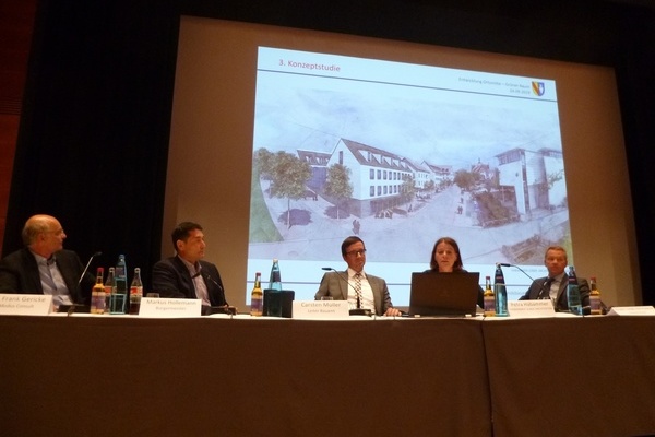 Am Dienstag, 24.09.2019, lud die Gemeinde Denzlingen zur Vorstellung einer Konzeptstudie für das Areal „Grüner Baum“ in das Kultur & Bürgerhaus ein. Nach einleitenden Worten von Bürgermeister Markus Hollemann erläuterten Verbandsbauamtsleiter Carsten Müller und Architektin Petra Habammer (Habammer Leiber Architekten) die Konzeptstudie unter Bezugnahme auf die gemeindlichen Vorgaben. Mit am Tisch saßen auch Jürgen Lange-von Kulessa, der die Konzeptstudie als Geschäftsführer der Ergo-nInvest in Auftrag gegeben hat, sowie Verkehrsplaner Dr. Frank Gericke vom Büro Modus Consult.Foto v.l.n.r.: