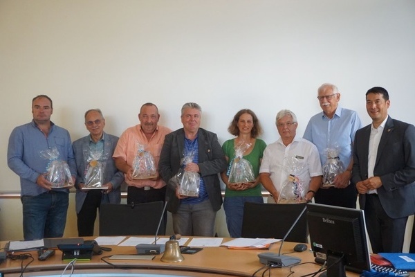 In der letzten Gemeinderatssitzung am 09.07.2019 wurden nach der Gemeinderatswahl im Mai acht Denzlinger Gemeinderäte aus ihrem Ehrenamt verabschiedet. Bürgermeister Markus Hollemann bedankte sich bei allen scheidenden Gemeinderäten für die gute, konstruktive Zusammenarbeit im Gremium und ihr Engagement für die Gemeinde Denzlingen in den vergangenen Jahren. Zum Abschied sprach er einige persönliche Worte und überreichte allen ein Präsent der Gemeinde.Foto v.l.n.r.: Sascha Ingold (CDU), Jochen Himpele (SPD), Ringold Wagner, Harald Martin (beide Freie Wähler), Christine Höldin (UB/ÖDP), Jürgen Kaufmann (SPD) und Robert Reichinger (Bürgerliste); Rolf Fehrenbach (CDU) fehlte bei der Verabschiedung