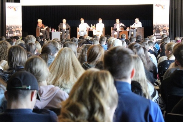 Bürgermeister Markus Hollemann dankte als Schirmherr der Veranstaltung allen, die zur Durchführung des Projekts beigetragen hatten. Dann übernahmen Benedikt C. Falk (JGR-Sprecher und Schüler des Erasmus-Gymnasiums) und Leon Pieper (SMV des Erasmus-Gymnasiums) gekonnt die Moderation. Zwischen ernsten Themen verstanden sie es, die Stimmung immer wieder aufzulockern und das Treffen geeignet zu gliedern. Den Politikern wurden verschiedene Aufgaben gestellt, bei denen sie sich und die Partei, für die sie stehen, präsentieren mussten. Nach einer kurzen Vorstellungsrunde sollten sie beispielsweise mit drei Worten die Werte und Ziele ihrer Partei beschreiben. Während Frau Wölfle die SPD als „sozial, gerecht und europäisch“, Herr Wintermeier die CDU als „werteorientiert, basisdemokratisch und als Volkspartei“ bezeichnete, beschrieb Herr Schoch Bündnis 90- Die Grünen als „ökologisch, basisdemokratisch und sozial“ und Herr Keck die FDP als „die demokratische Alternative, aus der Mitte heraus.“