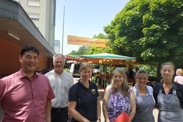 Foto: Marktbeschicker, v.l.n.r.: Bürgermeister Markus Hollemann, Elmar Heiny (Gemeinde Denzlingen), Sandra Ingold (Obst- und Gemüseanbau Familie Ingold), Claudia Jaskulski (Olivenstand), Heike Scherzinger und Ute Holzer (Landmetzgerei Ditolve); Foto: Julia Baumgartner