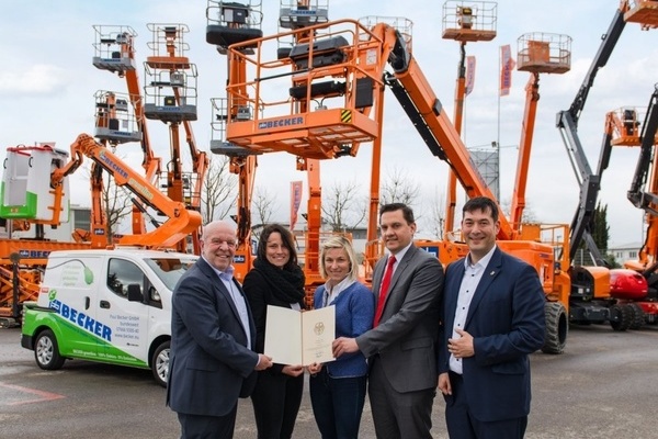"Die Firma Paul Becker GmbH ist ein herausragender Vorreiter in der Elektromobilität", so lobte SPD-Bundestagsabgeordneter Johannes Fechner die Denzlinger Paul Becker GmbH im Rahmen der Übergabe des Förderbescheides über 780.000 Euro. Diese Summe erhält die Paul Becker GmbH aus einem Förderprogramm des Bundes für Elektromobilität. Damit werden in den nächsten Jahren mehrere Elektrofahrzeuge mit Hebebühnen gekauft, die den unterschiedlichen Mietinteressenten zur Verfügung stehen. Die Vorteile sind wie Geschäftsführer Harald Becker erläuterte, dass leise und somit auch während Ruhezeiten und emissionsarm in Innenstadtbereichen und Wohngebieten gearbeitet werden kann. Allerdings bekam Fechner nicht nur Lob und Dank für den hohen Zuschuss, sondern auch einige Hausaufgaben mit. So gibt es die Förderung von Elektromobilität bislang nur für das Fahrzeug, nicht aber für die Aufbauten wie die Hebebühnen. Auch werden zwar Ladestationen gefördert, nicht aber die Kabelverlegung aus dem allgemeinen Gemeindenetz bis zur Ladestation. Schließlich sind Elektrofahrzeuge wegen der schweren Batterien so schwer, dass sie oft über der von vielen Führerscheinen erfassten 3,5-Tonnen-Grenze liegen und deshalb teure Führerscheine gemacht werden müssen. Fechner sagte Unterstützung zu, weil diese Hindernisse ausgeräumt werden müssten, um die Elektromobilität auch in Industrie und Gewerbe voranzutreiben.Foto v.l.n.r.: Harald Becker (Geschäftsführer), Sabrina Binz (Geschäftsführerin), Vanessa Binz (Geschäftsführerin), Dr. Johannes Fechner (MdB) und Bürgermeister Markus Hollemann bei der Übergabe des Förderbescheids