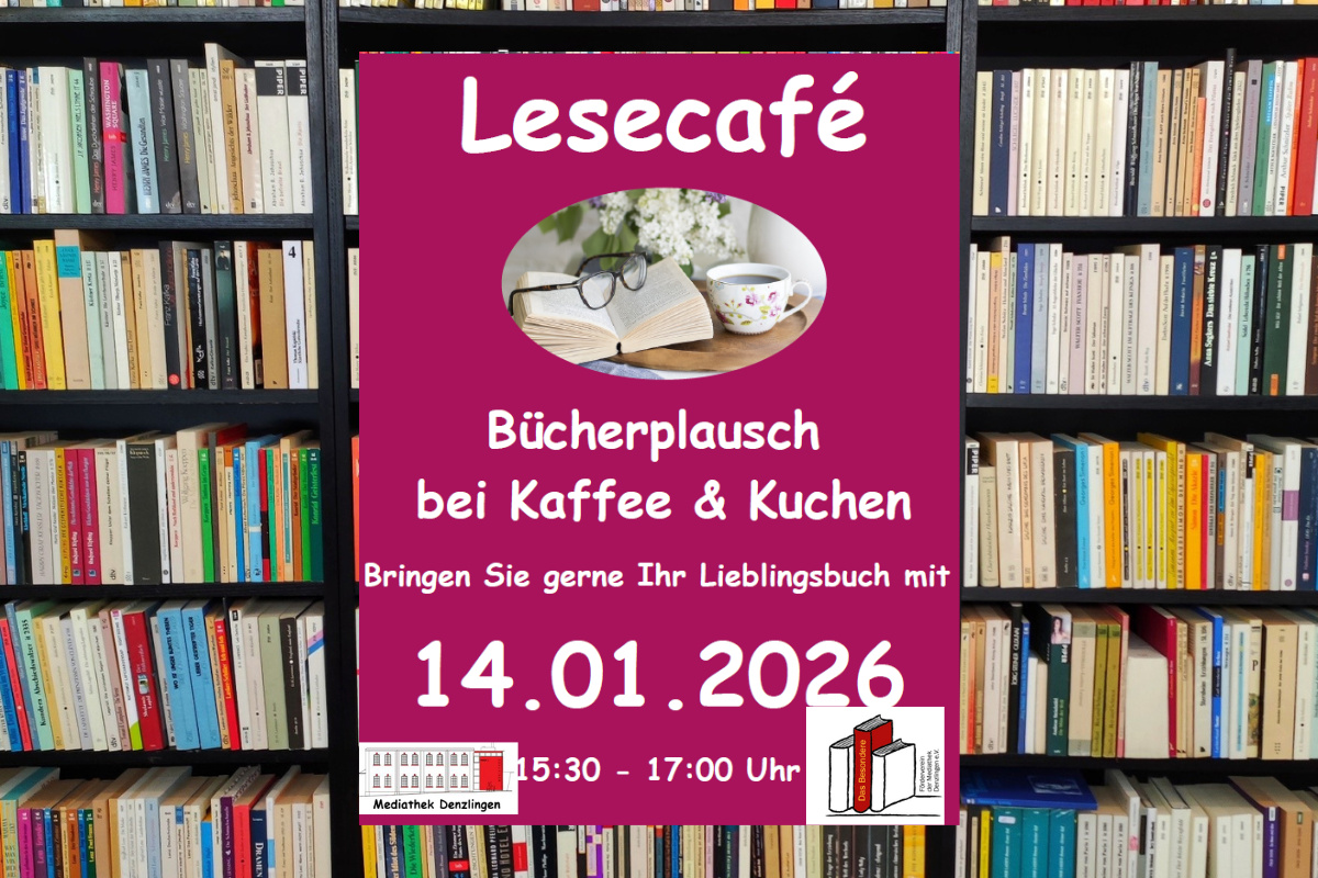 Mi, 14. Januar 2026 | 15:30 Uhr - 17:00 UhrLesecafé in der MediathekDer Förderverein der Mediathek Denzlingen veranstaltet am Mittwoch 14. Januar 2026 um 15.30 Uhr das dritte Lesecafé in der Mediathek. Bei Kaffee, Tee und Kuchen können sich die Gäste in gemütlicher Atmosphäre über Bücher austauschen. Bringen Sie gerne Ihr aktuelles Lieblingsbuch mit oder holen Sie sich einfach nur Anregungen für Ihre nächste Lektüre.