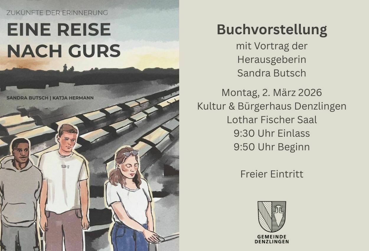 Mo, 02. März 2026 | 09:30 UhrEinladung zur Buchvorstellung: „Zukünfte der Erinnerung – Eine Reise nach Gurs“Die Gemeinde Denzlingen lädt herzlich ein zur Vorstellung der Graphic Novel „Zukünfte der Erinnerung – Eine Reise nach Gurs“.