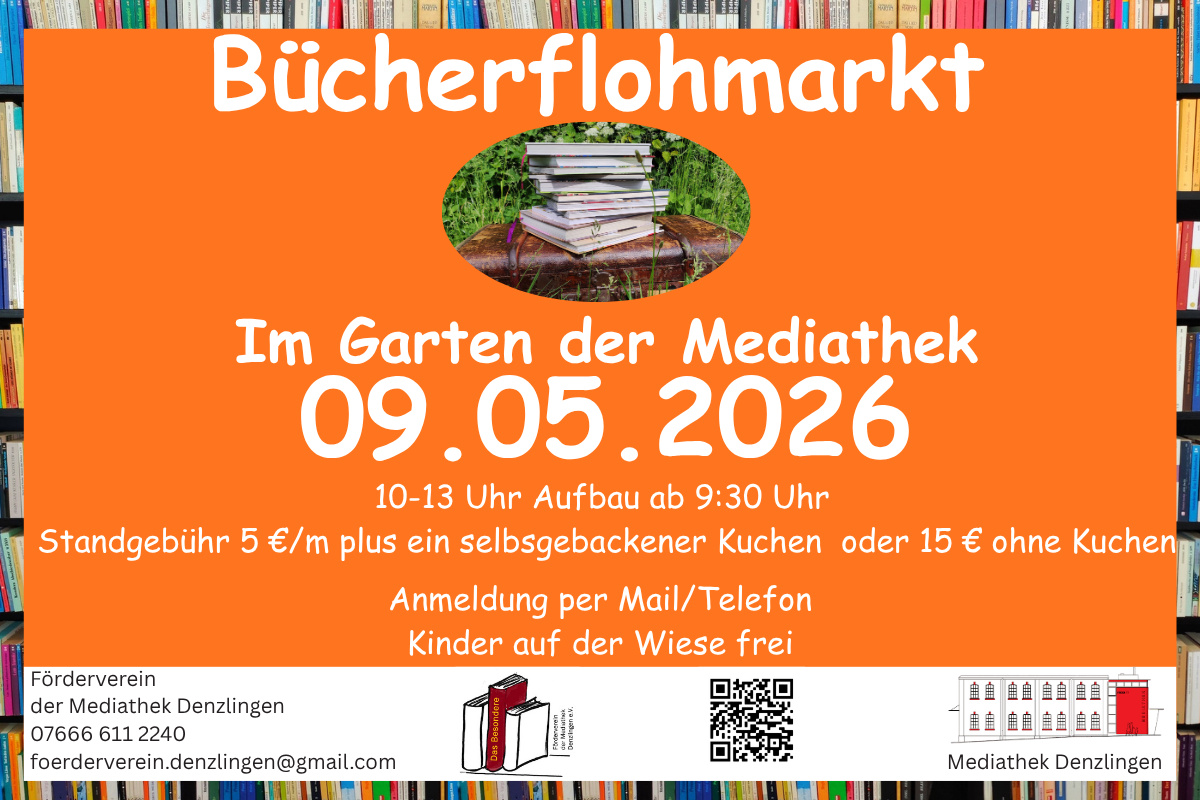 Sa, 09. Mai 2026 | 10:00 Uhr - 13:00 UhrBücherflohmarktFür den Bücherflohmarkt im Garten der Mediathek können Sie sich anmelden telefonisch 07666/611-2240 oder per Mail foerderverein.mediathek@gmail.com