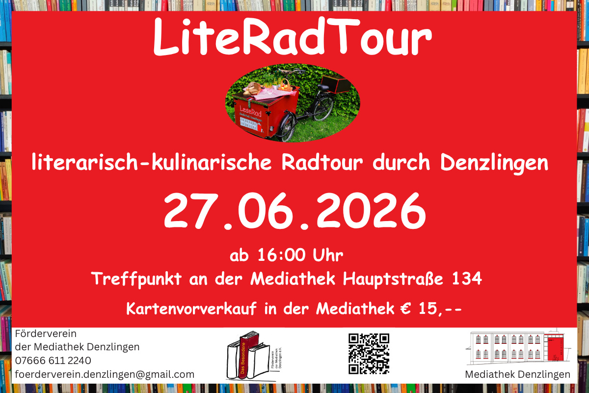 Sa, 27. Juni 2026 | 16:00 Uhr - 21:00 UhrLiteRadTourDer Förderverein der Mediathek veranstaltet am 27. Juni 2026 die dritte LiteRadTour, eine literarische-kulinarische Fahrradtour. Gemeinsam werden vier verschiedene Stationen in und um Denzlingen angefahren, um sich dort sowohl literarisch mit einer zum Ort passenden kurzen Lesung, als auch kulinarisch verwöhnen zu lassen.