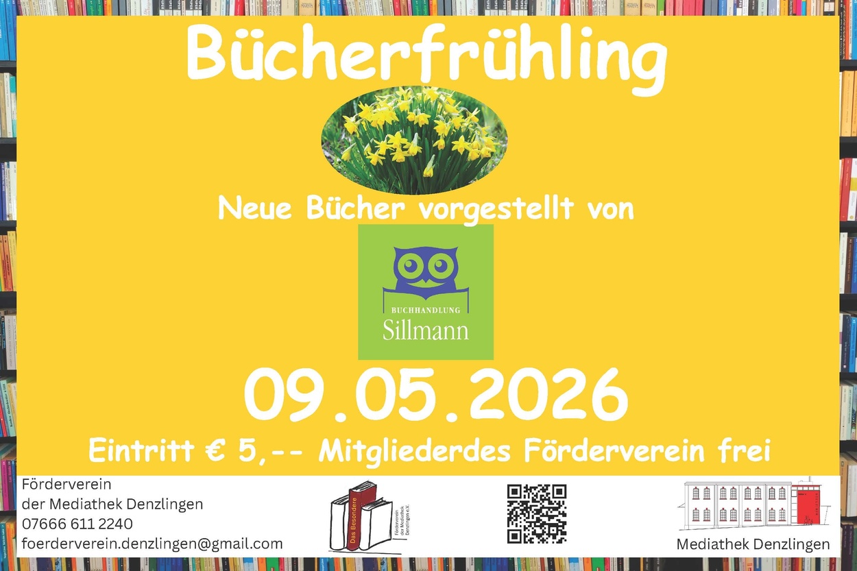 Leseempfehlungen für die ersten warmen Sonnenstrahlen gibt es beim Bücherfrühling in der Mediathek Denzlingen Dort kann man auf Einladung des Fördervereins der Mediathek die frühlingshaften Neuerscheinungen entdecken. Das Team der Buchhandlung Sillmann stellt eine bunte Mischung an Literatur vor, die den Frühling schöner machen. Der Förderverein sorgt für den gemütlichen Rahmen. Karten zu 5€ gibt es an der Abendkasse, Mitglieder des Fördervereins der Mediathek genießen freien Eintritt.