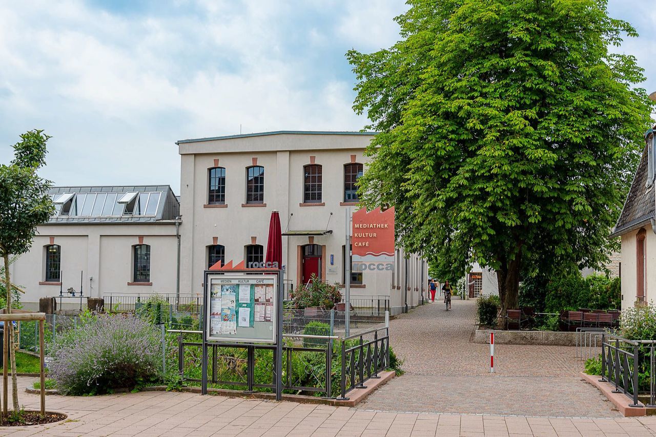 Erbaut 1996 als Verwaltungsgebäude für den Gemeindeverwaltungsverband Denzlingen-Vörstetten-Reute. Neugestalteter Rathausplatz mit Brunnen und Bächle. - Denzlinger Heimethues, Museum